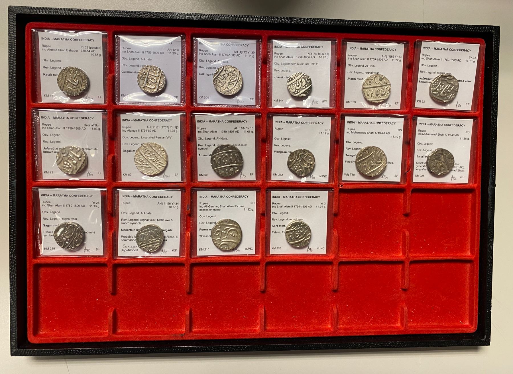 MARATHA CONFEDERACY: LOT of 16 silver rupees, from the following states: Ahmadabad (KM-50, year 15); Bagalkot (KM-82, AH[11]81 year 15); Chandor (2 pcs, both KM-93, ND); Jhansi (2 pcs, KM-139, AH1185/13, and KM-144, ND); Gokulgarh (KM-304, 1212/39; Gulshanabad (KM-324, 1236); Katak (KM-16, year 52); Kora (KM-162, year 3); Poona (KM-216, ND); Sabalgarh (KM, 1188/34); Sagar (KM-239, year 28); Sangli (KM-225, ND); Toragal (Wig-T1a, ND); and Viphgaon (KM-312, ND); all but one of the Jhansi rupees are VF or better, several nice EF); all with Todd's attribution; retail value $800, lot of 16 pieces, ex Ian Todd Collection.
