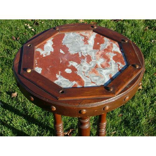 BEAUTIFUL MARBLE TOP TABLE OR STAND, BEAUTIFUL ROSE MARBLE SWIRL ON THE TOP, MADE OF RUSTIC WOOD MAYBE MAPLE. VERY UNIQUE, ORNATE