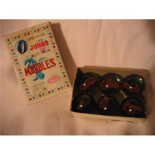 This is a boxed set of 6 very large marbles--what we used to call Cats' Eyes. In small printo on the box: A magnificent collection of polished marbles--the finest quality available (C) Shackman NY 10001, #4721, Made in Japan. It appears that one marble has been used; it has small "dents."