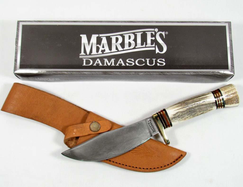 MARBLES DAMASCUS HUNTING KNIFE W/ STAG HANDLE AND SHEATH IN ORIG. BOX - Approx. 10.5" long overall