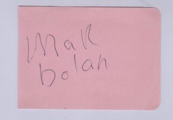 A cut autograph of Marc Bolan signed in ball point pen to a pink album page. 9 1/2 cm by 7 cm in size clear on the verso. Marc Bolan (born Mark Feld; 30 September 1947 – 16 September 1977) was an English singer-songwriter, musician, guitarist, and poet. He was best known as the lead singer of the glam rock band T. Rex. Bolan was one of the first pioneers of the glam rock movement of the 1970s.