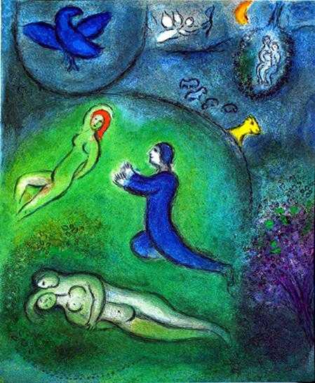 Marc Chagall was born in 1887 to a poor Jewish family in Russia. He was the eldest of nine children. Chagall began to display his artistic talent while studying at a secular Russian school, and despite his father’s disapproval, in 1907 he began studying art with Leon Bakst in St. Petersburg. It was at this time that his distinct style that we recognize today began to emerge. As his paintings began to center on images from his childhood, the focus that would guide his artistic motivation for the rest of his life came to fruition. In 1910, Chagall, moved to Paris for four years. It was during this period that he painted some of his most famous paintings of the Jewish village, and developed the features that became recognizable trademarks of his art. Strong and bright colors began to portray the world in a dreamlike state. Fantasy, nostalgia, and religion began to fuse together to create otherworldly images. In 1914, before the outbreak of World War I, Chagall held a one-man show in Berlin, exhibiting work dominated by Jewish images. During the war, he resided in Russia, and in 1917, endorsing the revolution, he was appointed Commissar for Fine Arts in Vitebsk and then director of the newly established Free Academy of Art. In 1922, Chagall left Russia, settling in France one year later. He lived there permanently except for the years 1941 - 1948 when, fleeing France during World War II, he resided in the United States. Chagall's horror over the Nazi rise to power is expressed in works depicting Jewish martyrs and refugees. In addition to images of the Jewish world, Chagall's paintings are inspired by themes from the Bible. His fascination with the Bible culminated in a series of over 100 etchings illustrating the Bible, many of which incorporate elements from folklore and from religious life in Russia. Israel, which Chagall first visited in 1931 for the opening of the Tel Aviv Art Museum, is likewise endowed with some of Chagall's work, most notably the twelve stained glass windows at Hadassah Hospital and wall decorations at the Knesset. Chagall received many prizes and much recognition for his work. He was also one of very few artists to exhibit work at the Louvre in their lifetime.