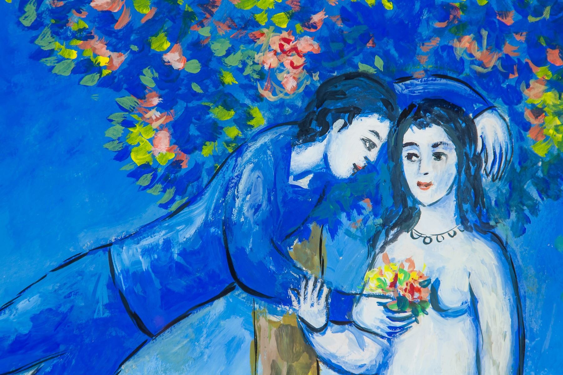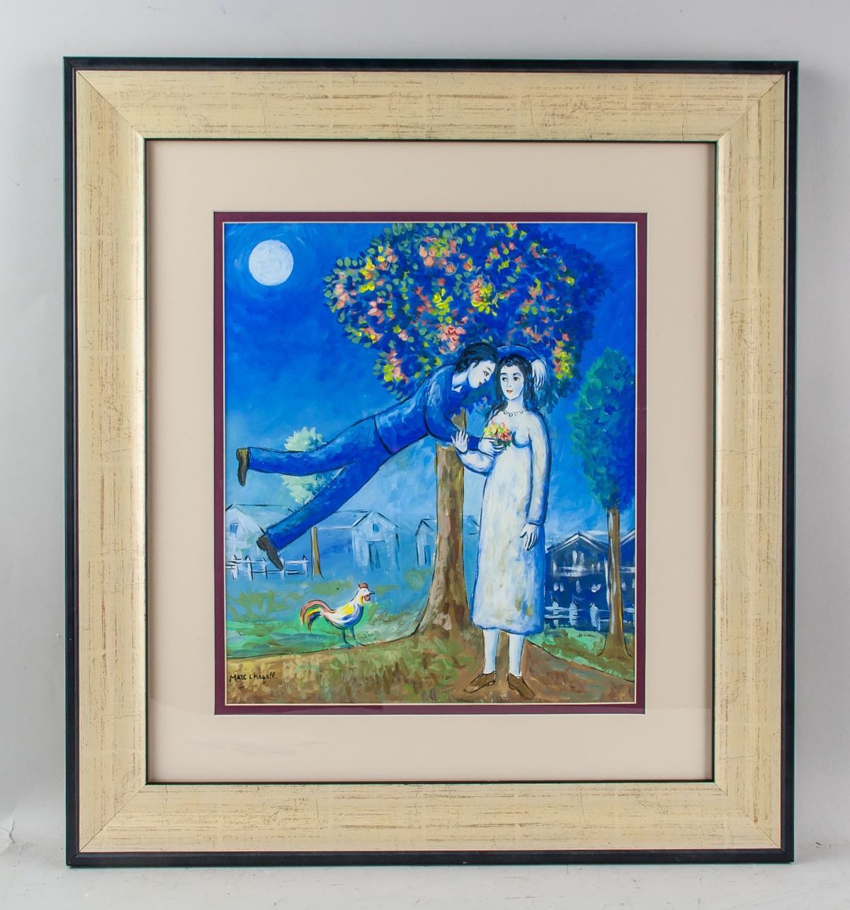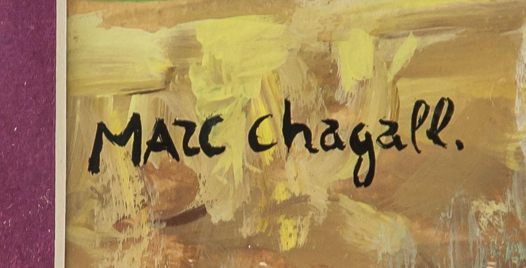 Gouache on paper, framed. Featuring a couple embracing within a surreal landscape scene. Signed and attr. Marc Chagall (French, 1887-1985) on the lower left corner. 34 x 29.5 cm (13..4 x 11.6 inches). Frame size: 57 x 32 cm (22.5 x 12.6 inches). Honored for his distinct style and pioneering role among Jewish artists, Marc Chagall painted dream-like subjects rooted in personal history and Eastern European folklore. He worked in several mediums, including painting, printmaking, and book illustration, and his stained glass windows can be seen in New York, France, and Jerusalem. Chagall arrived in Paris in 1910 and began experimenting with Cubism, befriending painters Robert Delaunay and Fernand Leger. Chagall’s style has been described as a hybrid of Cubism, Fauvism, and Symbolism, and his supernatural subjects are thought to have significantly influenced the Surrealists. Though he actively engaged in the Parisian artistic community, art for Chagall was first and foremost a means of personal expression. He preferred to be considered separately from other artists, his imagery and allegory uniquely his own. PROVENANCE: Private estate (Ireland)