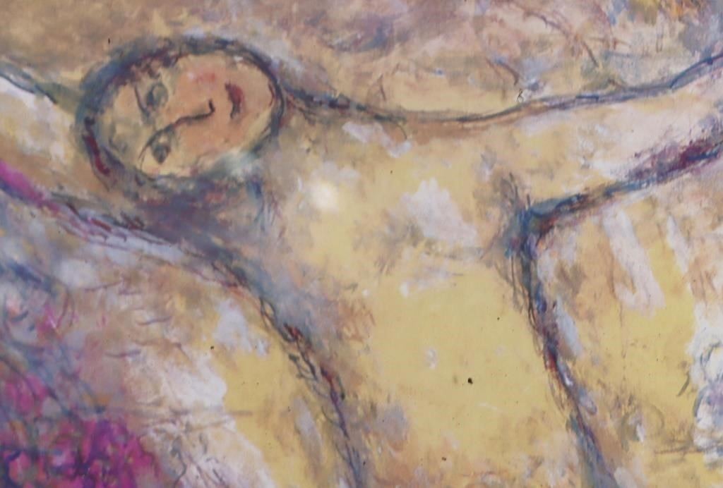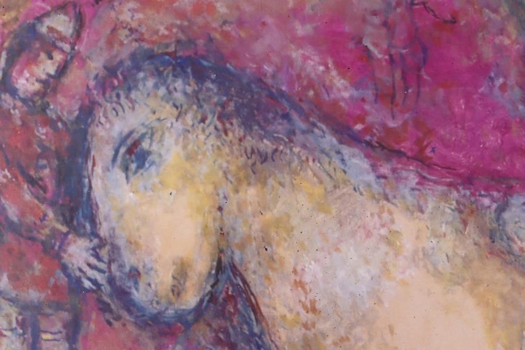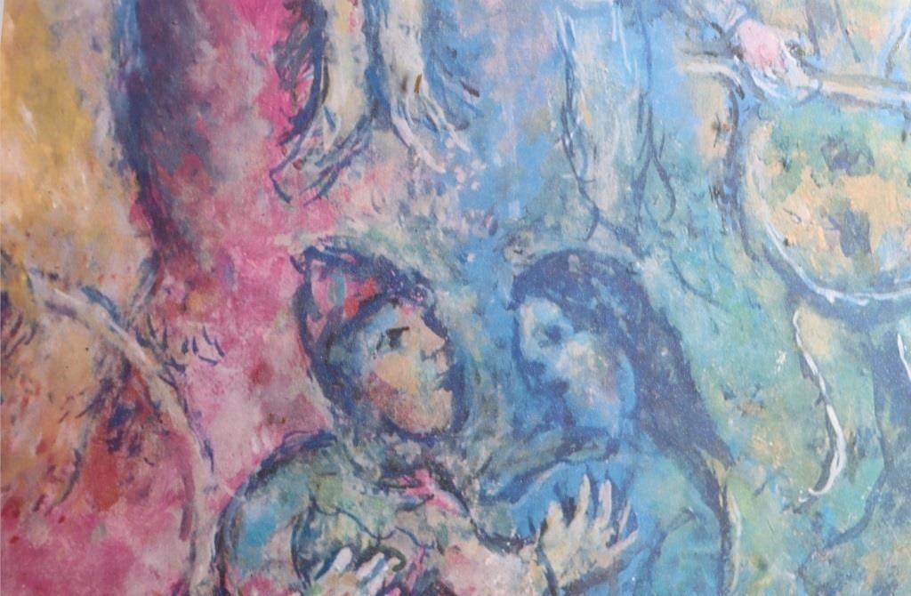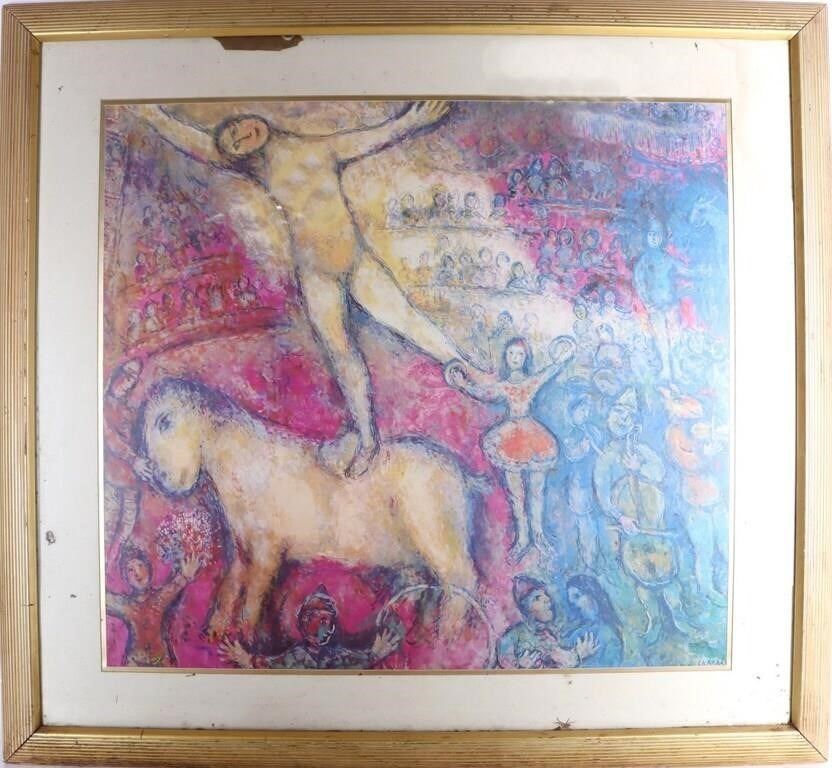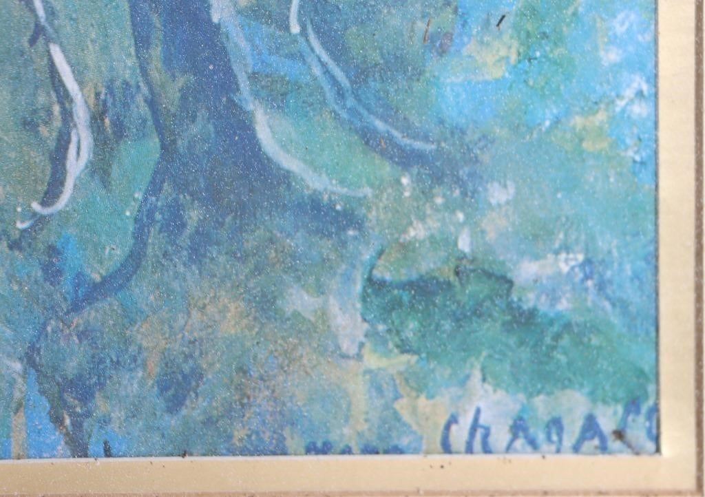 Marc Chagall (1887-1985, Russian-French) large abstract art print. An early modernist, he was associated with the École de Paris as well as several major artistic styles and created works in a wide range of artistic formats including: painting, drawings, book illustrations, stained glass, stage sets, ceramics, tapestries and fine art prints.