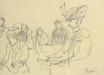 Chagall preferred to draw in his own style and he much criticised the traditional drawing of 'numerous plaster heads of Greek and Roman citizens projected from every corner and I, poor provincial, had to pore over the wretched nostrils of Alexander of Macedon - or some other plaster idiot' (My Life, p. 81). The young artist showed more interest in representing his fellow students drawing the model, rather than copying the model itself, as is clearly reflected in the present work. With a caricatural hint, Chagall depicts the serious students, occasionally enhancing individual traits.