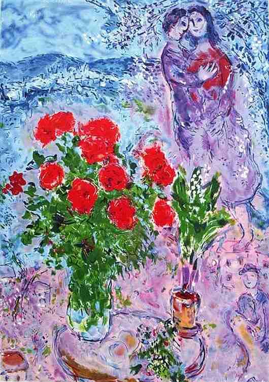 MARC CHAGALL "RED BOUQUET WITH LOVERS" - LIMITED EDITION GICLEE' ON HEAVY ARCHIVAL WOVE PAPER - NUMBERED IN PENCIL - SIGNED IN THE PLATE - PROFESSIONALLY FRAMED AND MATTED - MINT - 32" X 22" APPX PAGE SIZE
