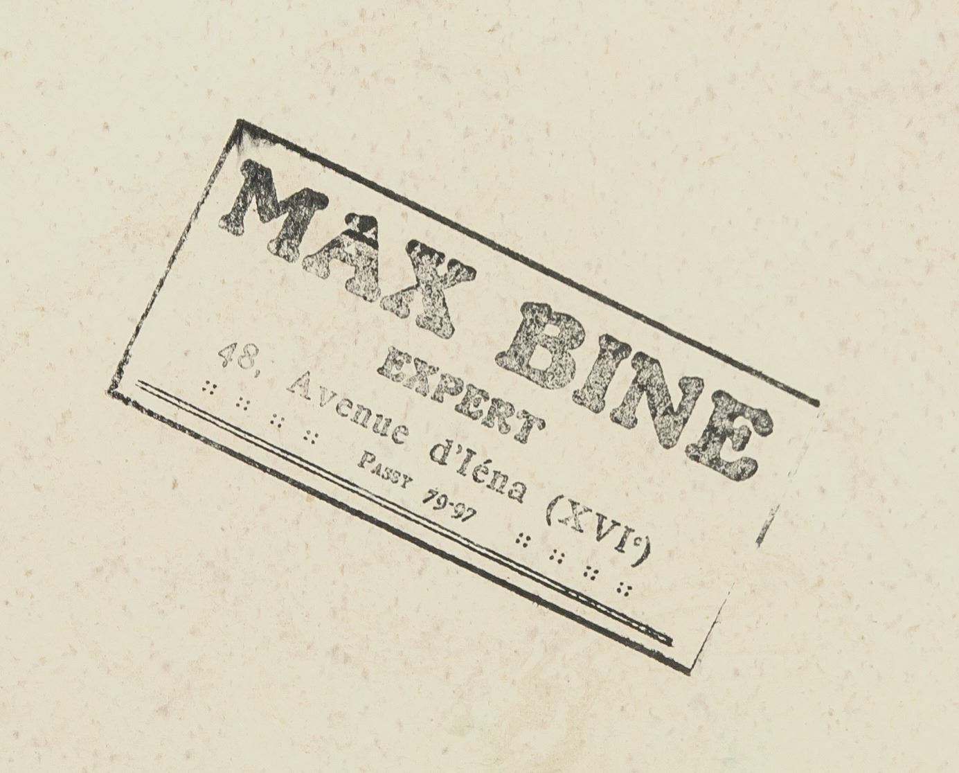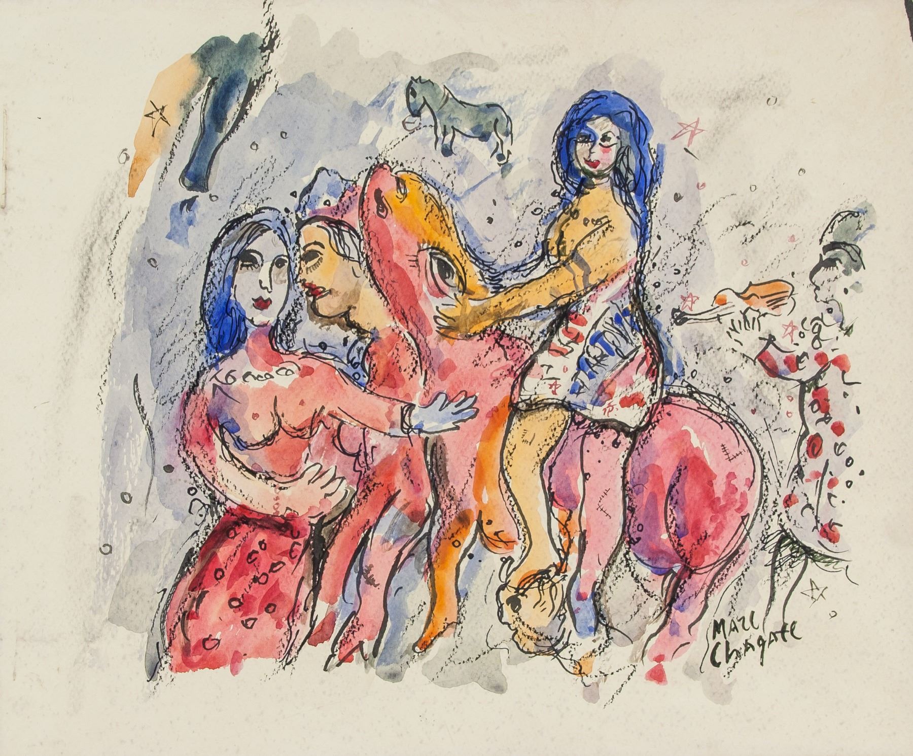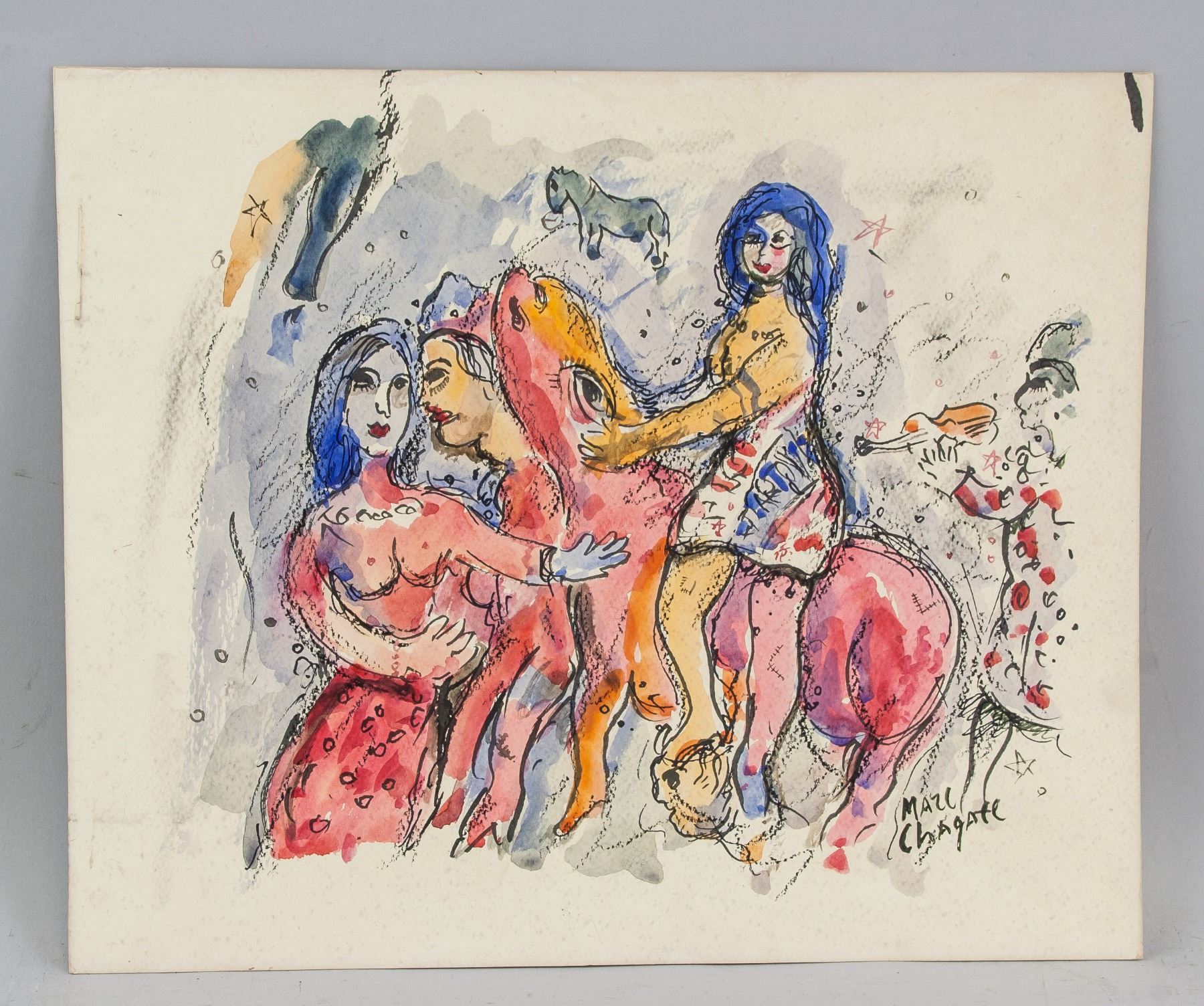 Mixed media on paper. Featuring surreal festive scene. Signed and attr. Marc Chagall (Russian-French, 1887-1985) on the lower right corner. Stamped “Max Bine Expert (48, Avenue d’lena (XVI)” on verso. 11.8 x 17.2 in. (30 x 36 cm). Honored for his distinct style and pioneering role among Jewish artists, Marc Chagall painted dream-like subjects rooted in personal history and Eastern European folklore. He worked in several mediums, including painting, printmaking, and book illustration, and his stained glass windows can be seen in New York, France, and Jerusalem. Chagall arrived in Paris in 1910 and began experimenting with Cubism, befriending painters Robert Delaunay and Fernand Leger. Chagall’s style has been described as a hybrid of Cubism, Fauvism, and Symbolism, and his supernatural subjects are thought to have significantly influenced the Surrealists. Though he actively engaged in the Parisian artistic community, art for Chagall was first and foremost a means of personal expression. He preferred to be considered separately from other artists, his imagery and allegory uniquely his own. PROVENANCE: Upper New York estate