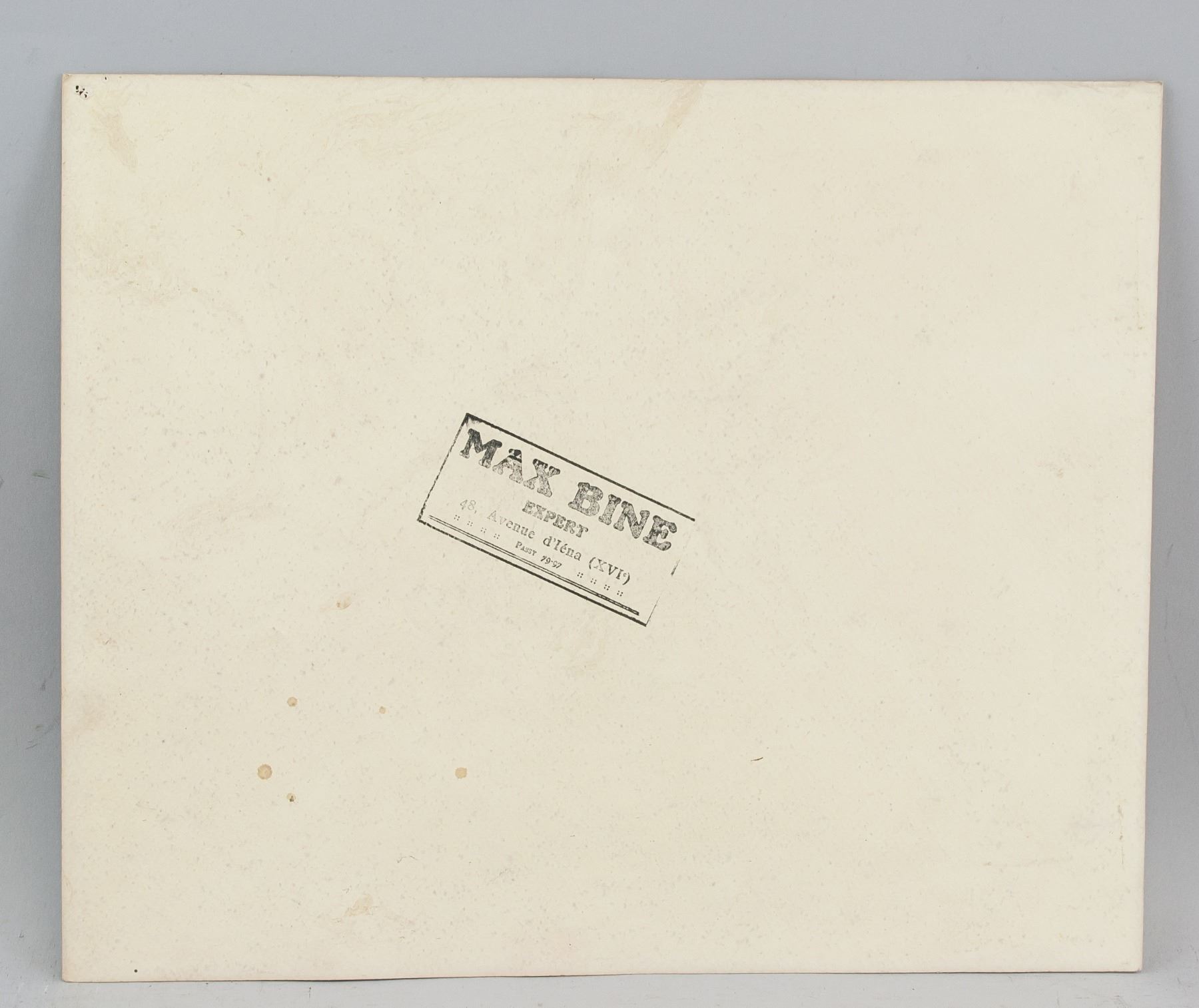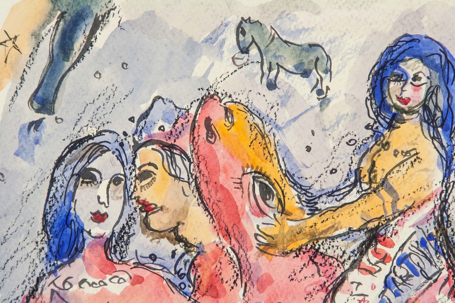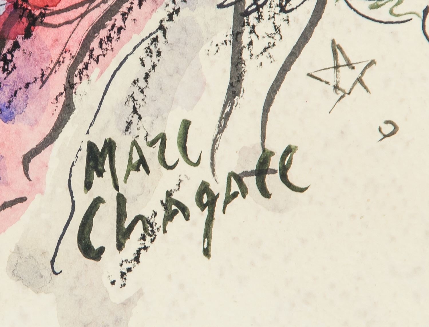 Mixed media on paper. Featuring surreal festive scene. Signed and attr. Marc Chagall (Russian-French, 1887-1985) on the lower right corner. Stamped “Max Bine Expert (48, Avenue d’lena (XVI)” on verso. 11.8 x 17.2 in. (30 x 36 cm). Honored for his distinct style and pioneering role among Jewish artists, Marc Chagall painted dream-like subjects rooted in personal history and Eastern European folklore. He worked in several mediums, including painting, printmaking, and book illustration, and his stained glass windows can be seen in New York, France, and Jerusalem. Chagall arrived in Paris in 1910 and began experimenting with Cubism, befriending painters Robert Delaunay and Fernand Leger. Chagall’s style has been described as a hybrid of Cubism, Fauvism, and Symbolism, and his supernatural subjects are thought to have significantly influenced the Surrealists. Though he actively engaged in the Parisian artistic community, art for Chagall was first and foremost a means of personal expression. He preferred to be considered separately from other artists, his imagery and allegory uniquely his own. PROVENANCE: Upper New York estate