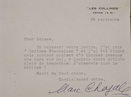 (1887 - 1985) French artist whose naive style incorporating subjects of Russian and Jewish life made him one of the foremost artists of this century. T.L.S. 1p. 8vo. Vence (France), Sept. 26, [n.y.], in French to fellow artist Jules Bastien-Lepage, in part: "...When I got your letter, I took 'Lettres Francaises' and I was surprised and, above all, happy to find in it almost a whole page about me, including your very sympathetic article. Would that I deserved it!". Lepage (1848-1884) is best remembered for his realist portraits painted outdoors with natural poses. Beautifully matted with a translation in sumptuous red velvet within an incredible carved gilt frame. Fine condition, a superb example for display.