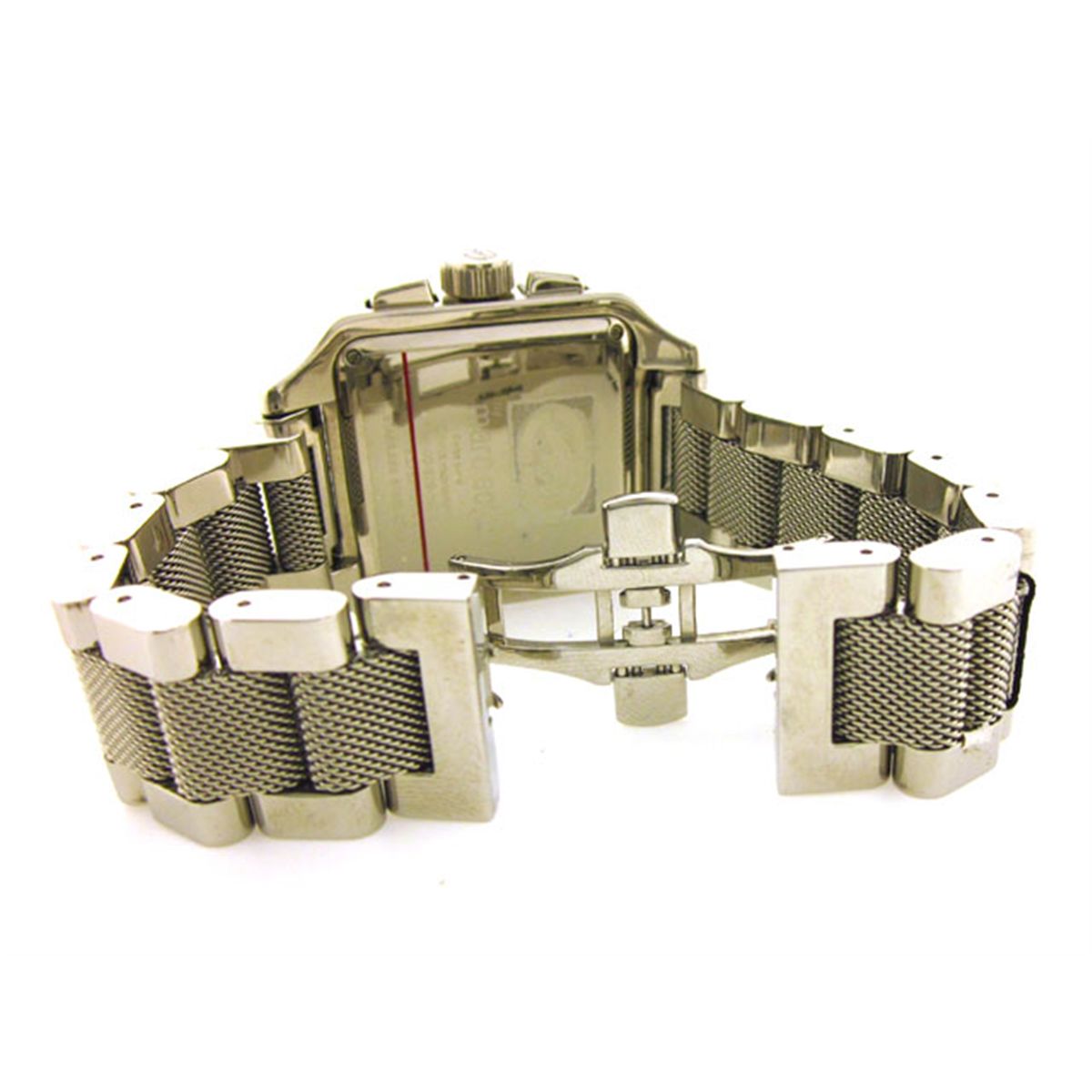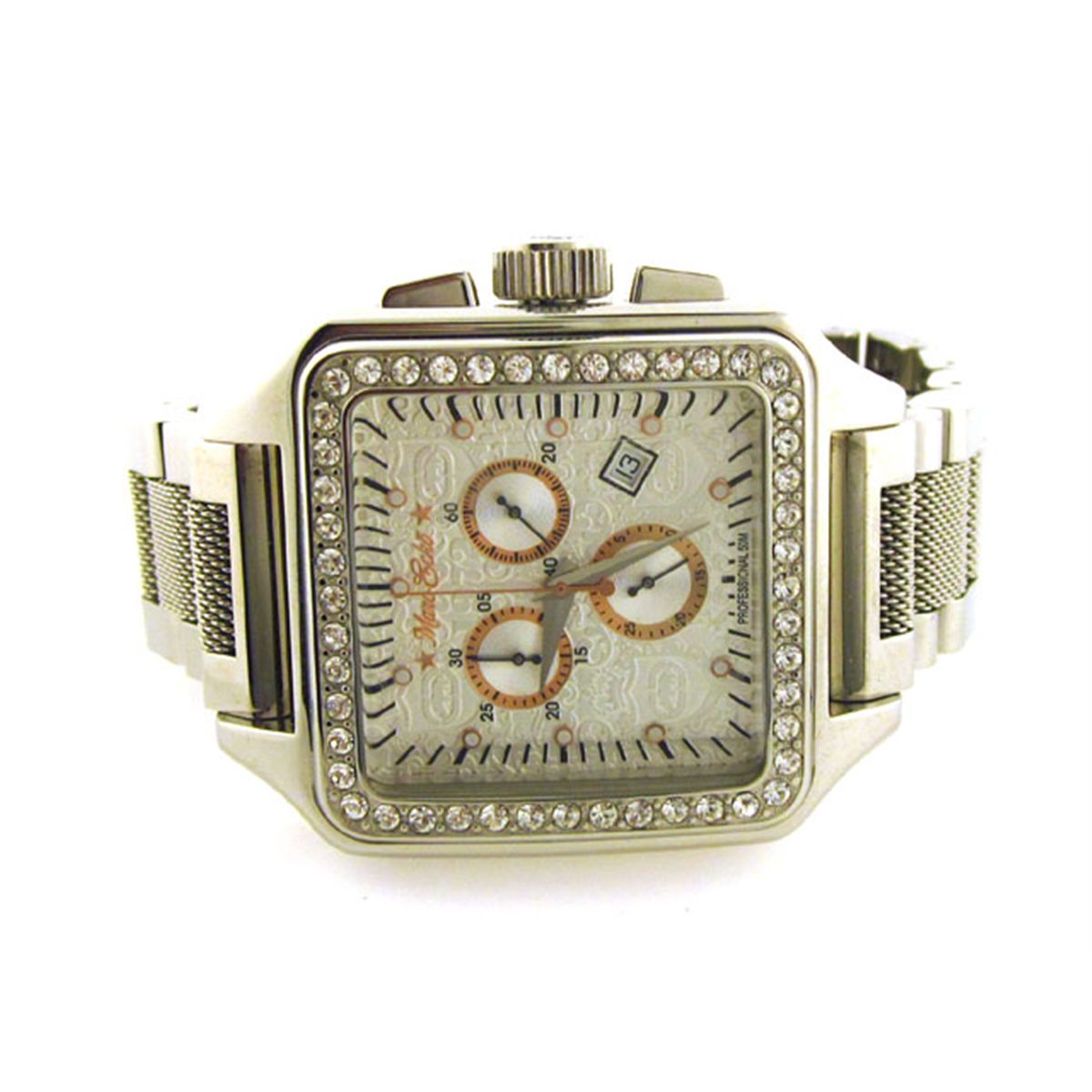 This is a MARC ECKO E27537G1 Men's Watch with the following features: Chronograph display; Invisible double locking clasp; Stainless steel case; 42 mm case diameter; 12 mm case thickness; 22 mm band width; Silver band; Black dial; Stainless steel bezel; Chronograph functions; Stone set bezel; item weight is 300 grams; Quartz movement; and Water resistant.