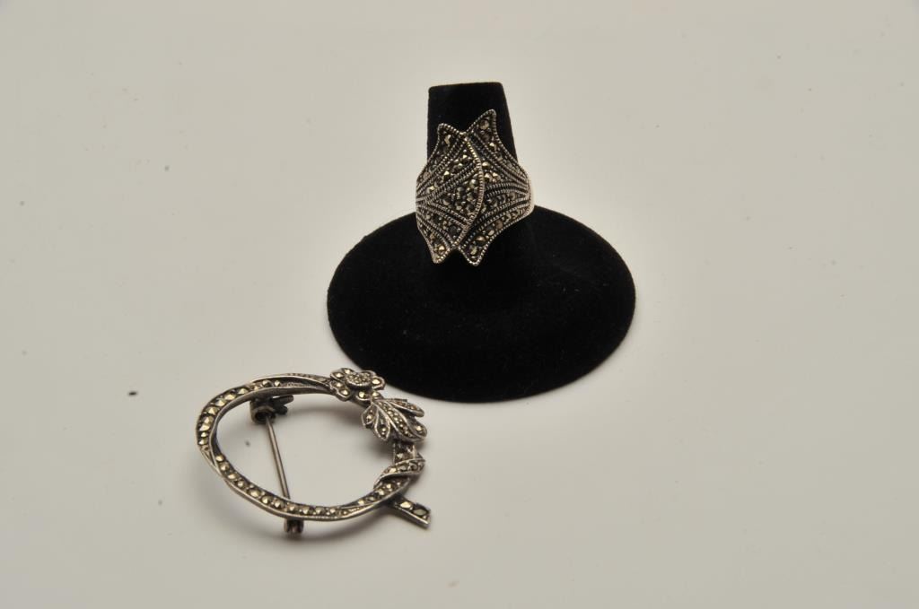 One beautiful antique marcasite pin and ring in sterling silver Est:$150-200