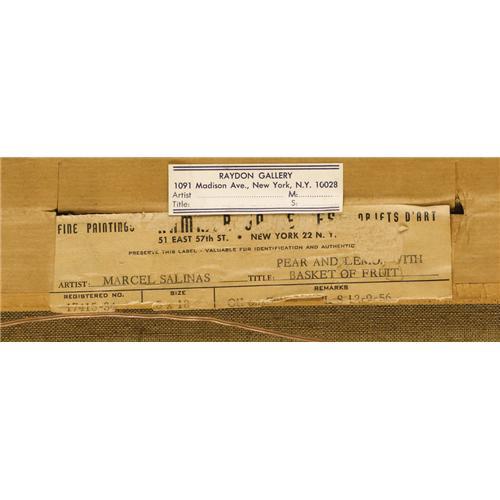 <B>MARCEL CHARLES LAURENT SALINAS</B></I> (French b.1913)<BR><I>Still Life With Basket Of Pears And Grapes</B></I><BR>Oil on canvas<BR>15 x 18 inches (38.1 x 45.7 cm)<BR>Signed upper left: <I>Salinas</B></I><BR><BR> <B>Condition Report:</B> relined<BR><BR><b>Shipping:</b> Requires 3rd Party Shipping (<a target="_blank" href="http://www.heritageauctions.com/common/shipping.php">view shipping information</a>)
