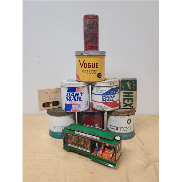 TEN VINTAGE TOBACCO TINS & TIN TROLLEY TOY