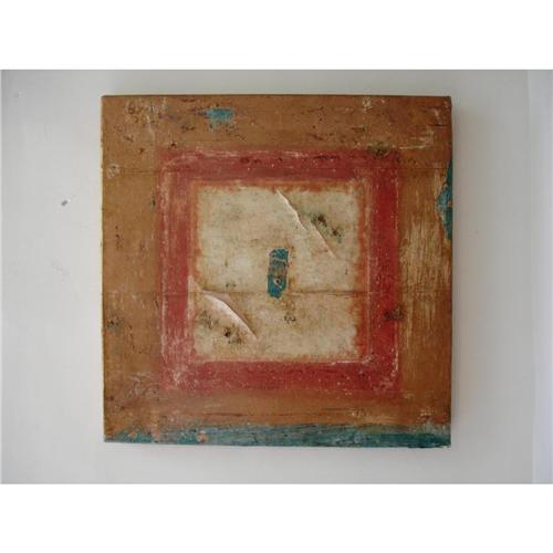 “Centosesantuno CLXI;” 2000. An abstract concentric rectangular composition executed in radiating hues of red and amber, and centered by a blue patch. Signed on the verso and with a label giving the medium and size.