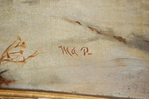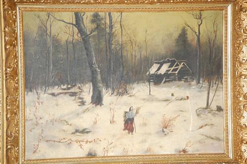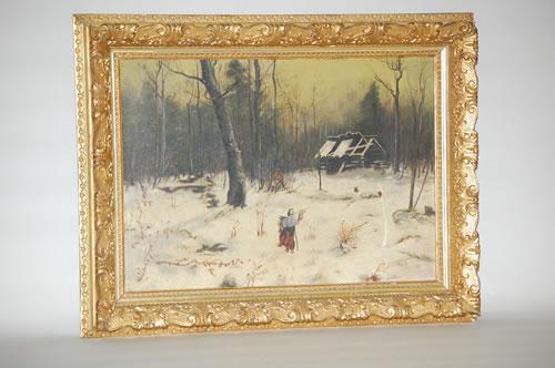 MARCIA P. RYDER OIL PAINTING - 19TH CENT. O/C OF WINTER LANDSCAPE IN THE WOODS W/ PEASANT & LOG CABIN RUIN NEARBY-SIGNED MA. P ON LOWER RIGHT & PROPERTY LABEL W/ NAME ON BACK IN A GILT MOLDED FRAME (13 3/4" X 19 1/2") - WEAR, SOILING, IMPERFECTIONS