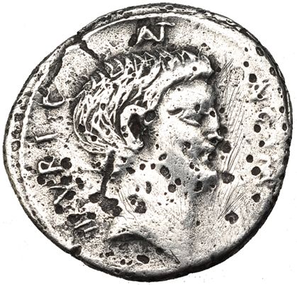 MARCO ANTONIO. Denario. Ceca volante (41 a.C.). R/ La Piedad a izq. con cornucopia y timón, cigüeña a izq.; PIETAS COS. FFC-74. SB-77. Erosiones y rayas. BC. Muy escasa.