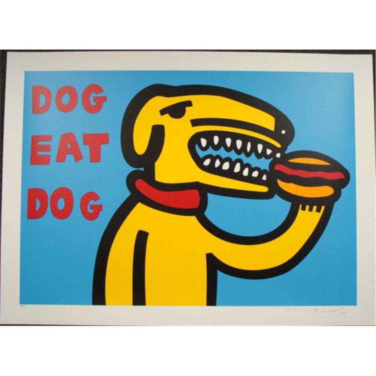We're happy to offer DOG EAT DOG (BLUE), a Pop art print on paper by well-known artist MARCO: * 2000 * Serigraph on paper * 24 × 35 * Signed and numbered from a limited edition of 400 plus APs * Bright and fresh; never mounted, matted or framed * Certificate of Authenticity * * Here's the buzz from the bio page on the well-known artist's web site: "Marco's work has graced the front page of the NY Times Sunday Magazine, Crain's New York, ADWEEK, and was recently featured on the hit FOX TV Show American Idol, New York One, NBC s TODAY Show, and ESPN's Cold Pizza. Marco was appointed as an Official Artist for The 2004 US Olympic Team by The United States Olympic Committee, and created POP Portraits of all of the 2003 NBA All Star Players including Michael Jordan, and Shaquille O'Neil. Gibson Musical Instruments released a hand painted "Marcoart Guitar" and watch giant Swatch commissioned Marco to paint over fifty of it's stores worldwide, in addition to having him create the best selling Artist Swatch of all time: "The Alien Baby." Express commissioned Marco to design "Cyclone Angel" hang tags for their jeans, Onward enlisted Marco to design an entire product line for their "Field Dream" stores in Japan, and Deutsche Telecom printed up 250,000 phone cards with Marco's images on them. Marco has raised thousands of dollars by donating his masterful dynamic paintings to benefits for: The Rainforest Alliance; The Gay and Lesbian Anti-Defamation League; Body Positive; Muscular Dystrophy; United Cerebral Palsy; St. Vincent's Hospital and Mount Sinai Hospital to name just a few. Current projects include animation, children's books, an extensive clothing and product line, and worldwide fine art distribution. Not bad from someone who started as "The Prince of Greene Street" selling his canvases on the corner of Prince and Greene streets in SOHO in the late 80s." * * Wow! * * * SPECIAL SHIPPING NOTE: This print will be shipped rolled in a heavy duty mailing tube.