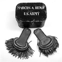 <b>360. MARCUS A. RENO'S EPAULETS </b>(1835 - 1889)<b> </b>Union brigadier general and Indian fighter with Custer at Little Big Horn, accused of cowardice and failure to support Custer during the massacre. A historic relic, Marcus A. Reno's gold epaulets worn by him during the Civil War and undoubtedly afterward, very likely during his service under George A. Custer and at the Battle of Little Big Horn. The epaulets are contained within a regulation japanned tin container with white lettering at top: "<i>MARCUS A. RENO<b> </b>U. S. ARMY</i>". During the Civil War, Reno's greatest rank achieved was Colonel of the 12th Pa., and at war's end he was breveted Brigadier General of Volunteers and brevet colonel in the army, with the rank of captain. These epaulets are of a design worn only by those with a rank of major or higher, therefore could only have been issued to Reno during the course of the war. The gold bullion hangs at a length of 3 1/2" indicating a rank of major or above, further corroborating his rank. The epaulets bear marks of having unit and rank insignia attached at top, but which are now lacking. This is consistent with Reno's post-war rank of captain in the regular army as he no longer held the rank of general or colonel. Before Little Big Horn, Reno was advanced to the rank of Major of the 7th Cavalry on December 26, 1868 and was therefore once again allowed to wear this style of epaulet. Following the Custer massacre on June 25, 1876 Reno faced a number of courts martial and was finally dismissed on trumped-up charges, on April 1, 1880, and returned home with these epaulets. Officer's epaulets were required to be worn whenever one was to meet the enemy or on duty; it is therefore entirely conceivable that these relics rode atop Reno's shoulders as he held-out against the attack of the Sioux at Little Big Horn. The epaulets bear signs of a great deal of use, having been crudely stitched at the sides of the bottom leather backing, a piece of copper wire replaces one hasp at bottom, and the brass attachments show signs of consistent use. The bottom of the bullion on one of the epaulets is crumpled, not noticeable when the epaulet sits as normal. Provenance: Butterfield Arms and Armor Sale, July, 2000, to our consignor.<b>$5,000-8,000</b>