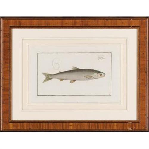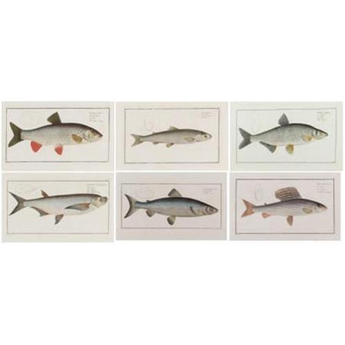 <B>MARCUS ELIESER BLOCH (French, 1723-1799)</B></I><BR><BR>Six hand-colored engravings<BR>8 x 14 inches (20.3 x 35.6 cm) each Group of six prints from<I> Ichthyologie: The Vimba, The Blue Salmon, The Carp, The Grayling, The Knife-Carp, </B></I>and <I>The Umble</B></I><BR>Published in 1796<BR><B>Condition Report:</B> Minor rippling to paper. Matted and framed, not examined out of frames.<BR><BR><b>Shipping:</b> Requires 3rd Party Shipping (<a target="_blank" href="http://www.heritageauctions.com/common/shipping.php">view shipping information</a>