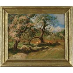 Lot # 1508 MARCUS WATERMAN (American, 1834-1914) “APPLE ORCHARD NEW ENGLAND FARM”. Oil on canvas landscape scene shows four blossoming apple trees with rocks and pasture. Three cows are seen lying down in clearing. Bright blue sky with pinkish white clouds. Unsigned front but old label to reverse with title and artist. Also presentation label “Presented to Eliott House by Mr. & Mrs. Franchi, Oct 1, 1950 Artist was Uncle of Mr. Franchi”. Housed in a textured gilt molded wood frame. SIZE: 16-1/4” x 20-1/2”. CONDITION: Craquelure. Small sliver chip to left corner, otherwise good. 9-98443 (1,400-1,800)