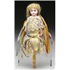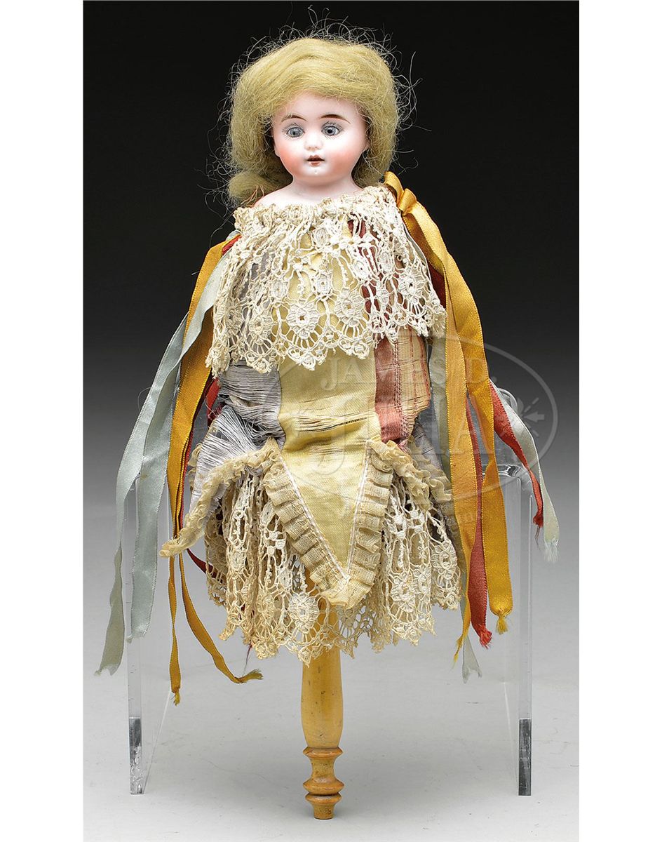 Circa 1890s dressed doll with bisque head, glass eyes, and hand painted facial features. Twirl the fancy carved handle and doll spins with plink-plonk music box notes. Fancy embroidered clothing with colored cloth streamers in Mardi Gras colors. SIZE: 14" l. CONDITION: Bust of bisque doll is excellent. Clothes are tattered but complete. Music box plays partial notes. 1-13456