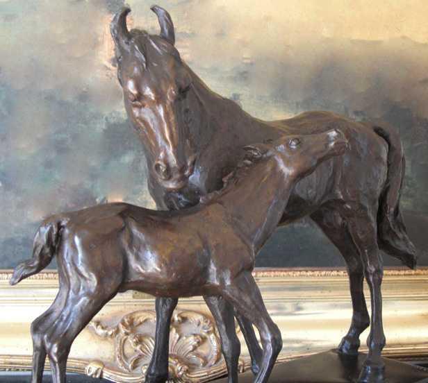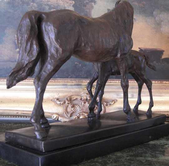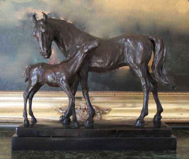 MARE & FOAL BRONZE SCULPURE - 13HX16WX7D - MOUNTED ON MARBLE - VERY GOOD DETAIL & BROWN PATINA W/HIGHLIGHTS