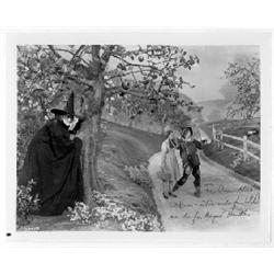 <b>1441. MARGARET HAMILTON </b>(1902 - 1985) American actress remembered for her role as the Wicked Witch of the West in <i>The Wizard of Oz</i>. Fine I.S.P. 10" x 8", a recent print from a still from <i>The Wizard of Oz </i>showing Hamilton in character crouching behind a tree as Dorothy and the Scare Crow walk down the yellow brick road. Boldly inscribed at lower right: "<i>Fr. Ann-Albert & Kevin-witch-wishes from WWW and love, Margaret Hamilton</i>". Three very slight creases affect margin, else near fine.<b> $150-200</b>
