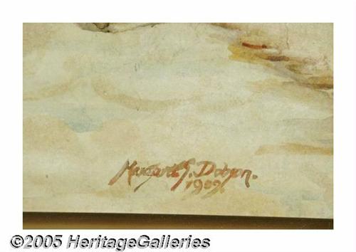 <B>MARGARET STIRLING DOBSON (British 20th Century)</B></I><BR>Dreams<BR>Watercolor on paper<BR>9.5in. x 16in.<BR>Signed and dated lower right<BR>Inscribed on reverse: 'Dreams, by Margaret Sterling Dobson<BR>Exhibited and purchased from Royal Scottish Academy, 1910'<BR><BR>Condition Report: Paper is yellowed and colors are faded from light exposure (not examined out of frame)<BR>