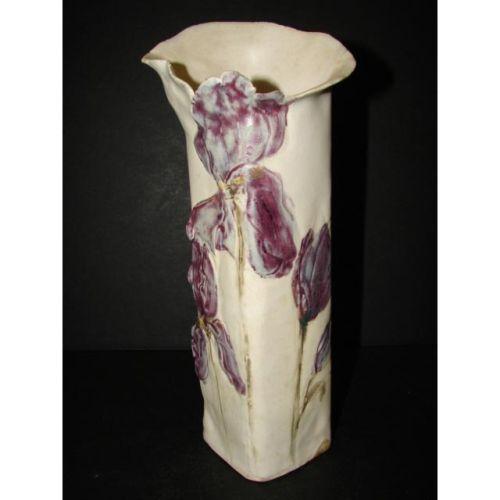 MARGE VIOLETTA, CRISFIELD, MARYLAND POTTERY VASE. Decorated with iris flowers. Retains original label on bottom that reads “Marge Violetta/Iris Vase #1”. 9.75” H. From the Estate of Governor Elbert N. Carvel (Governor of Delaware 1949-1953, 1961-1965) & Mrs. Ann Valliant Carvel.