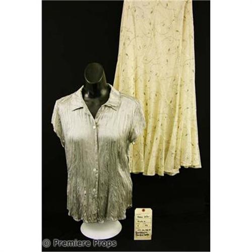 MARGOT AT THE WEDDING - An amazing screenworn costume from the film, this is Margot's (Nicole Kidman) silver silk crinkle "Calvin Klein" short-sleeve button-up shirt ( missing button) and cream-colored "Anne Klein" poly gauze skirt with metallic and cream flower pattern skirt. Wardrobe tag is included. Add a key costume from MARGOT AT THE WEDDING to your movie memorabilia collection today! (MAW1000)