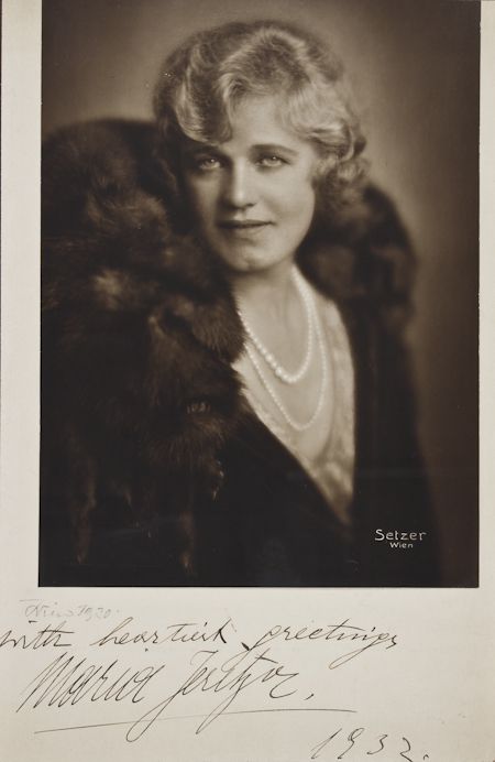 (1887-1982) Czech opera singer who achieved international fame as a prima donna soprano, especially in Tosca. S.P. 7" x 12" sepia by Setzer, Vienna, signed: "With heartiest greetings, Maria Jeritza, 1932". Trimmed at margins, else fine.