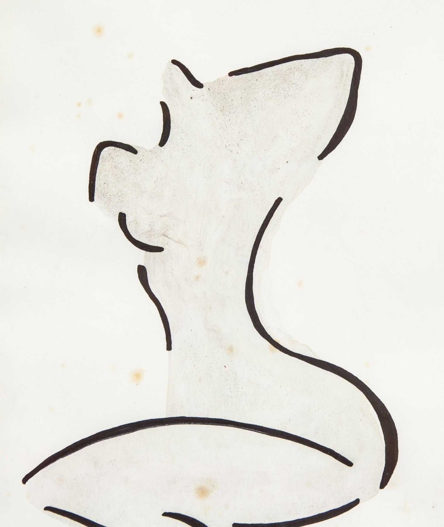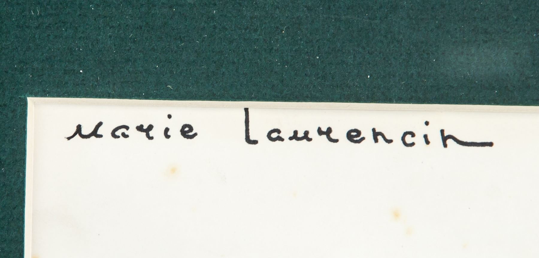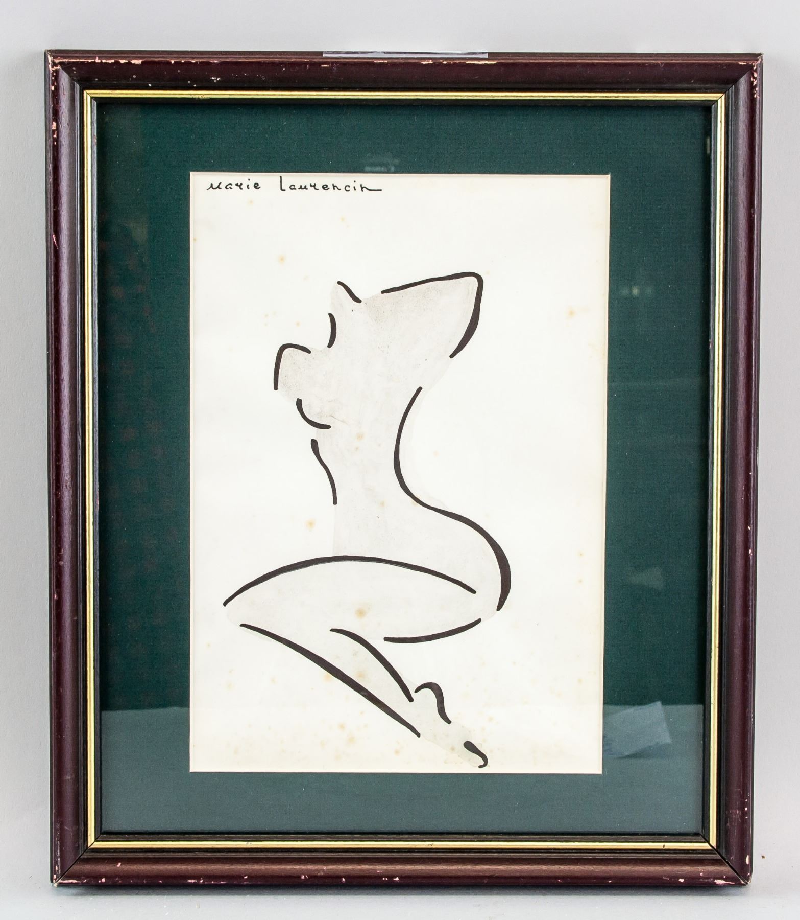 Gouache on paper, framed. Study, featuring nude. Signed and attr. Marie Laurencin (French, 1883-1956). 9 x 6.7 in. (23 x 17 cm). Marie Laurencin’s signature paintings feature graceful, pale-skinned, dark-eyed young women with dreamy expressions, rendered in pastel hues. After briefly flirting with the tenets of Cubism early on, Laurencin shied away from the modern styles of her day, drawing influence from Persian miniatures and the Rococo instead. Nonetheless, she befriended and exhibited alongside Pablo Picasso, including him in a group portrait along with herself and their respective lovers Fernande Olivier and Guillaume Apollinaire (Group of Artists, 1908). The anonymous seated figures in Women with a Dog (1923) exemplify the lyricism and idealized feminine beauty with which she was known to portray society women. In 1923 Coco Chanel commissioned a portrait, but rejected Laurencin’s image of her languishing in a chair for lack of likeness. PROVENANCE: Southern Ontario estate