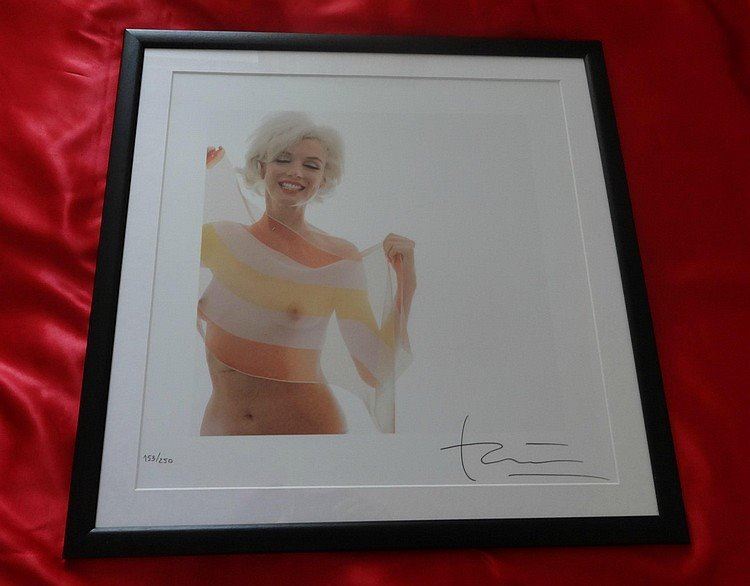 BERT STERN: Marilyn Monroe photograph from The Last Sitting taken in 1962 (Later print) The image measures 13x13 inches and the actual item measures 17x17 inches and is on Fuji Crystal Archive print contact sheet flush mounted to acid-free board, and is beautifully professionally framed in a black hard wood frame. Chromogene print, signed lower right, numbered lower left 153 out of 250. Print depicting iconic image of the actress, model and sex symbol Marilyn Monroe (American, born Norma Jeane Mortenson, 1926-1962). Image from Stern's shoot with Monroe in the famous Last Sitting in July of 1962 at the Bel Air Hotel in Los Angeles, California.
