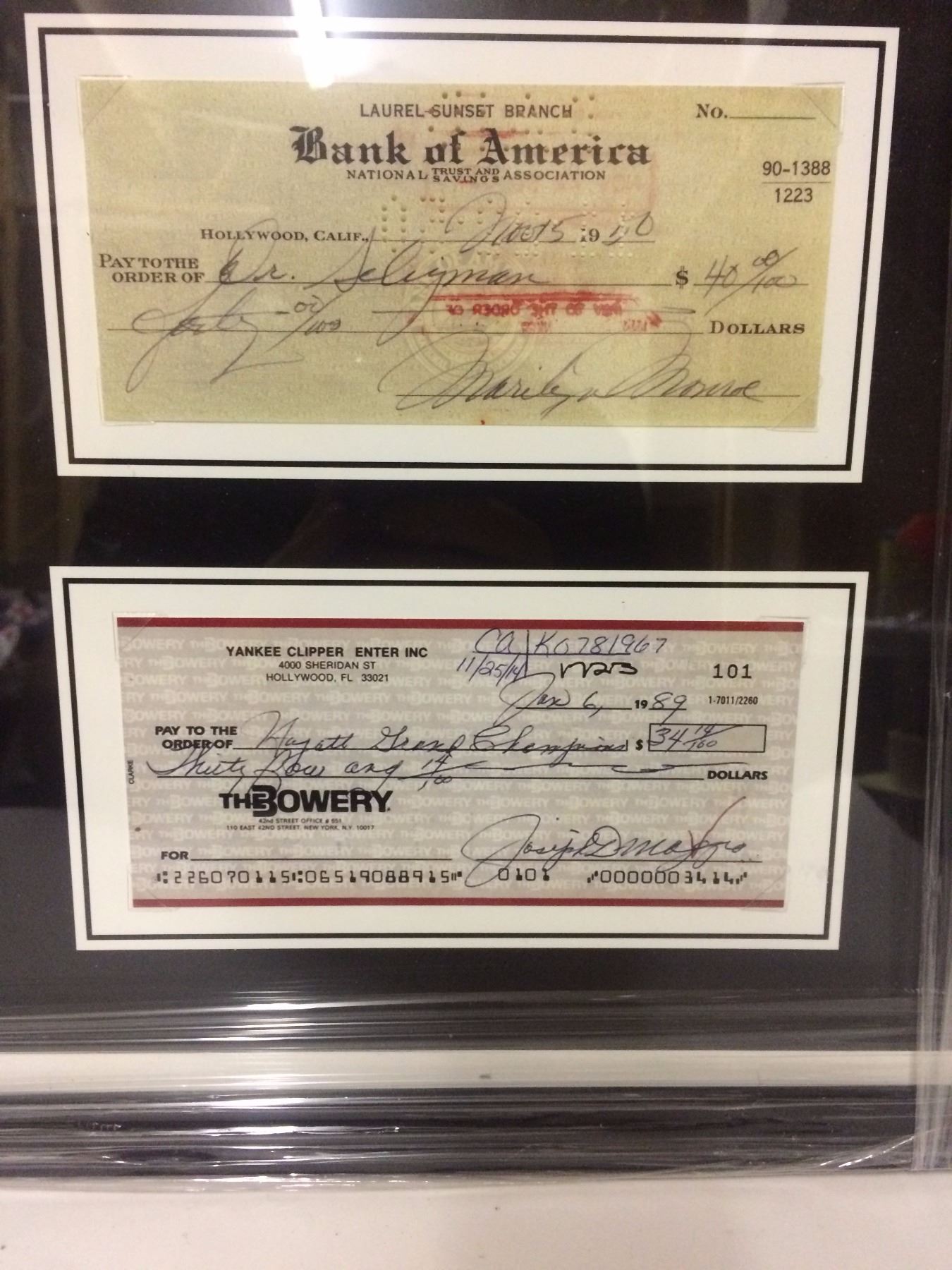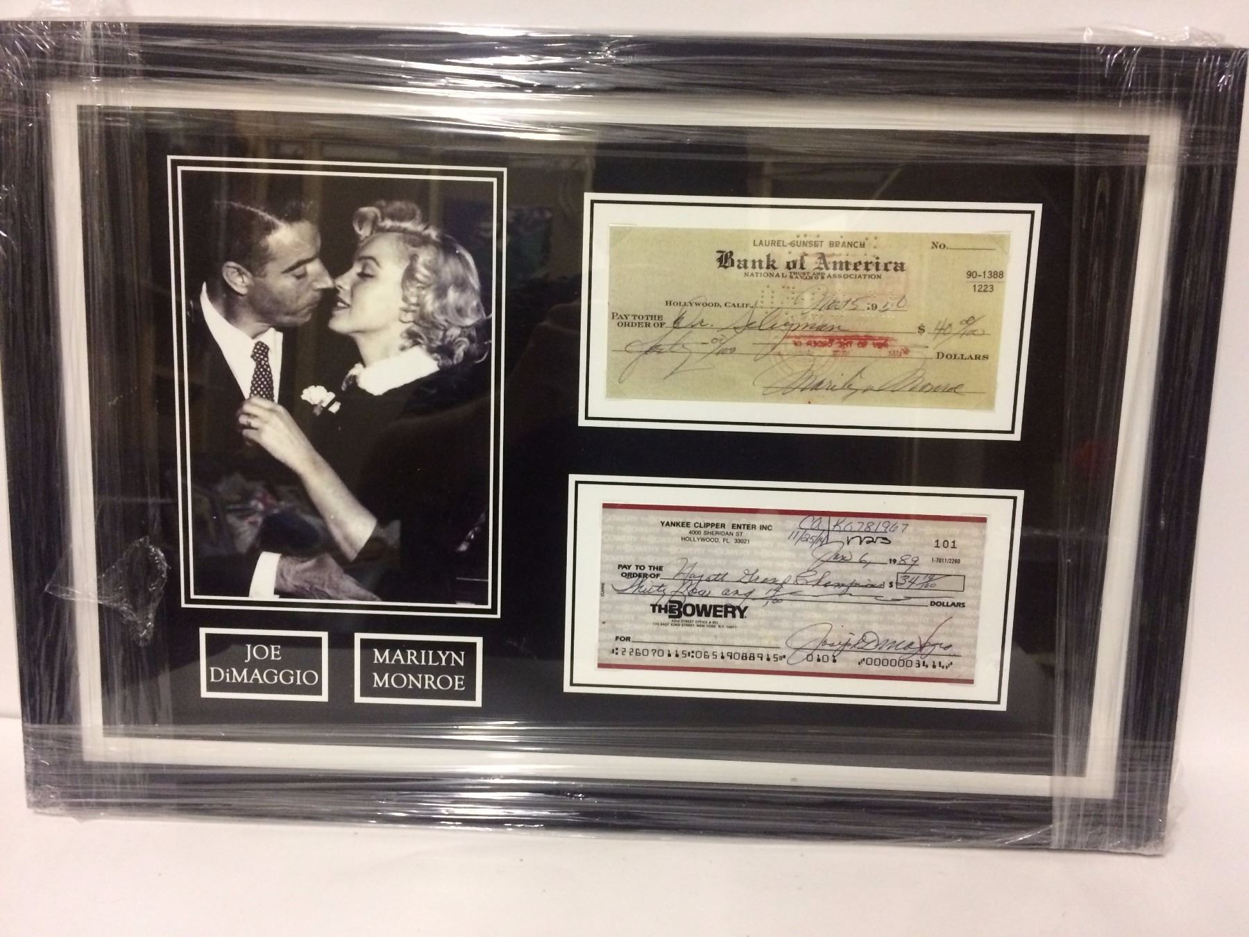 MARILYN MONROE & JOE DIMAGGIO SIGNED CHEQUE & PHOTO DISPLAY - 17 X 11