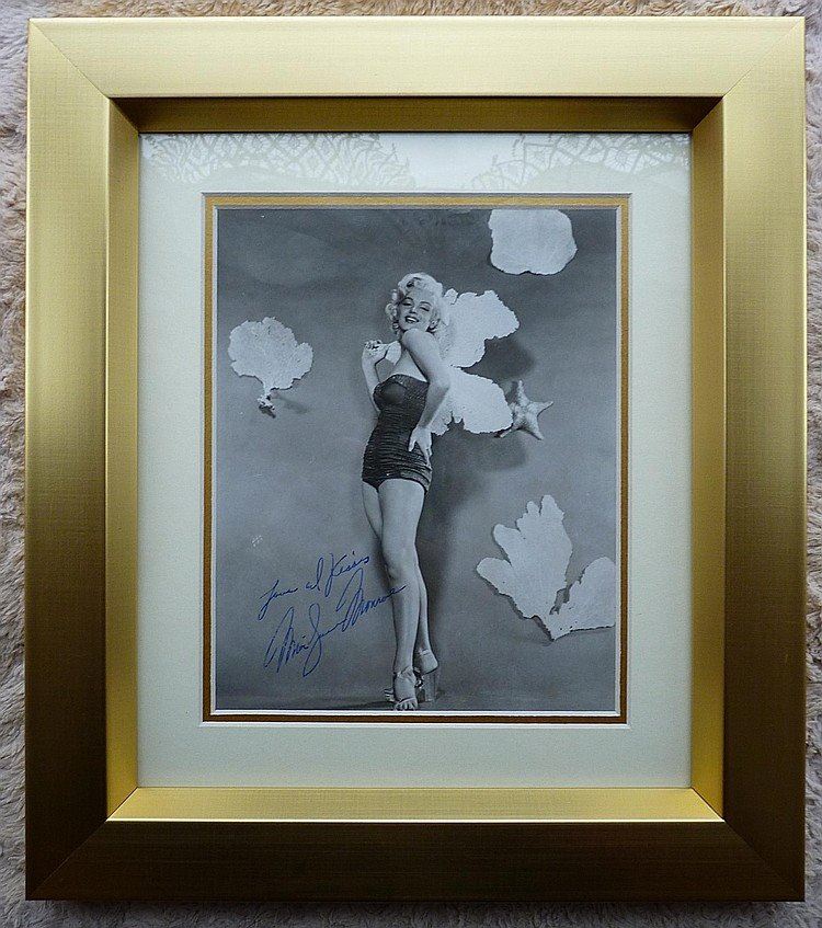 This is a beautiful original photograph at 9 inches by 7 1/2 inches in black and white or monochrome and this has been signed " Love and Kisses, Marilyn Monroe and this has been mounted and framed in matching gold frame and cut border mount. This is now 15 inches by 13 inches in size and ready to hang. This is a very crisp and clear signature and just a little marking where Marilyn inscribed and signed this where the ink did not take, this is an outstanding piece from a private collection and a must for any Monroe Collector. Provenance: Please note this item comes without a coa. Bid based on your own opinion.