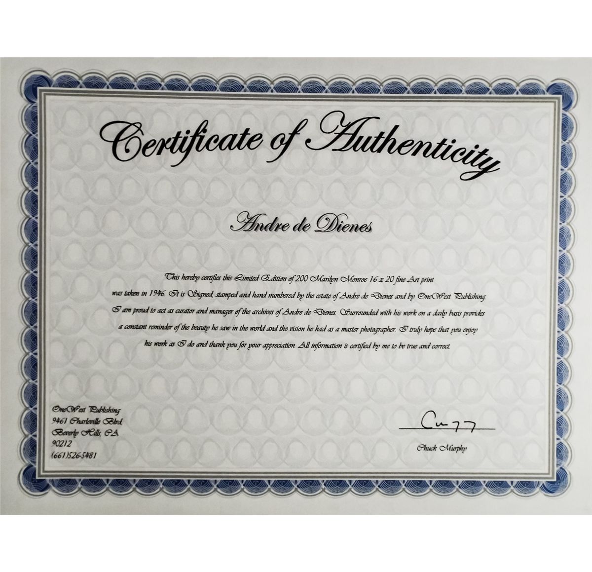 A limited edition art print of Marilyn Monroe by Andre de Dienes. Certificate of authenticity by One West Publishing. Measuring 16x20 inches.