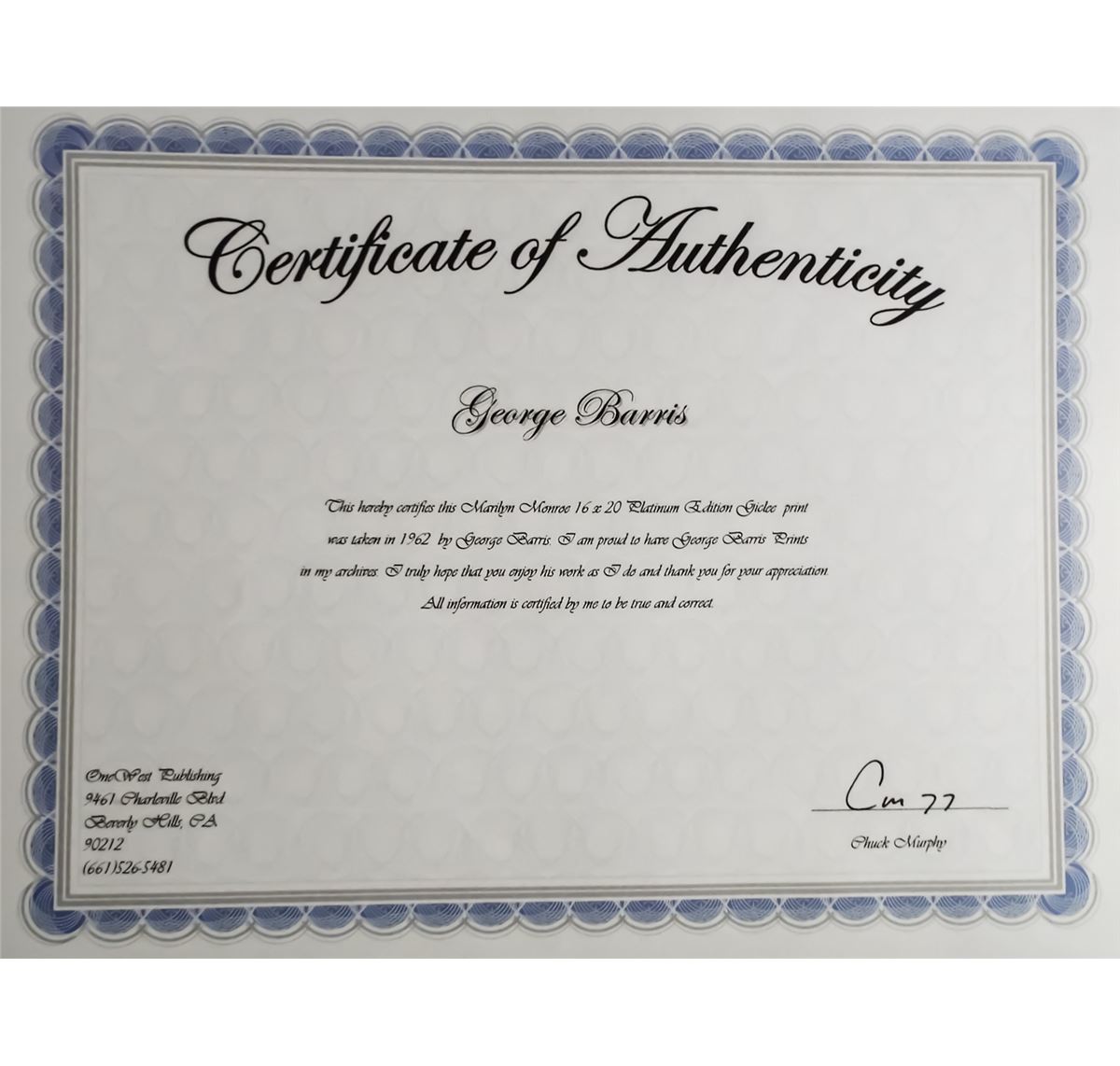 A Marilyn Monroe platinum edition giclee print taken in 1962 by George Barris. Certificate of authenticity by One West Publishing. Measuring 16x20 inches.