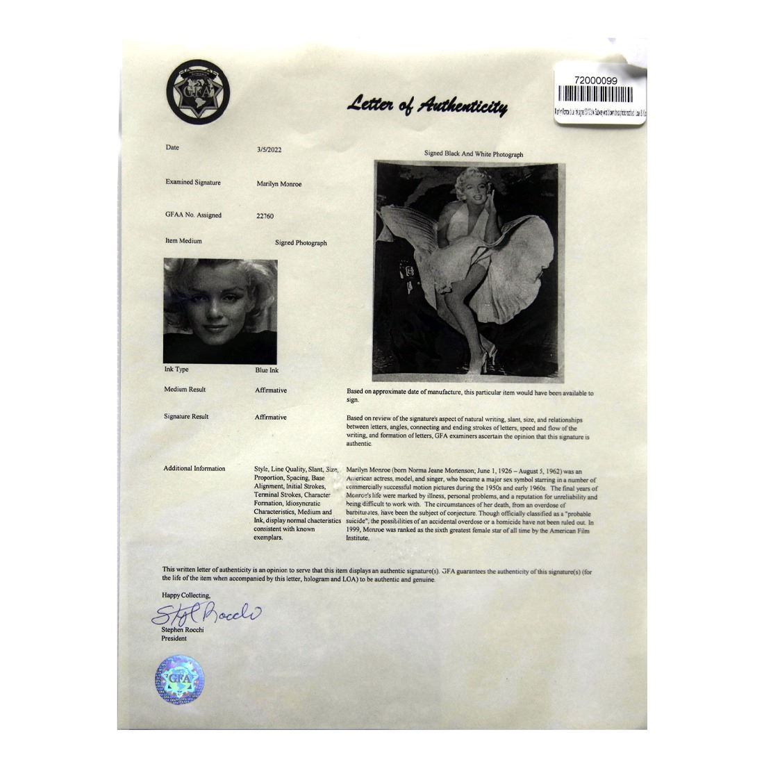 Marilyn Monroe blue ink signed 8X10 b/w Subway wind blown dress photo inscribed Love & Kisses to a Great Friend. Possibly the most iconic image of Marilyn. Marilyn Monroe was born on June 1, 1926, in Los Angeles, California. Actress Marilyn Monroe overcame a difficult childhood to become one of the world's biggest and most enduring sex symbols. Her films grossed more than $200 million. She is known for her relationships with Arthur Miller, Joe DiMaggio and, possibly, President John F. Kennedy. Monroe died of a drug overdose on August 5, 1962, at only 36 years old.This item has been proffesionally custom matted and framed and comes with a letter of authenticity issued by Guaranteed Forensic Authenticators along with the GFA guarantee of authenticity.