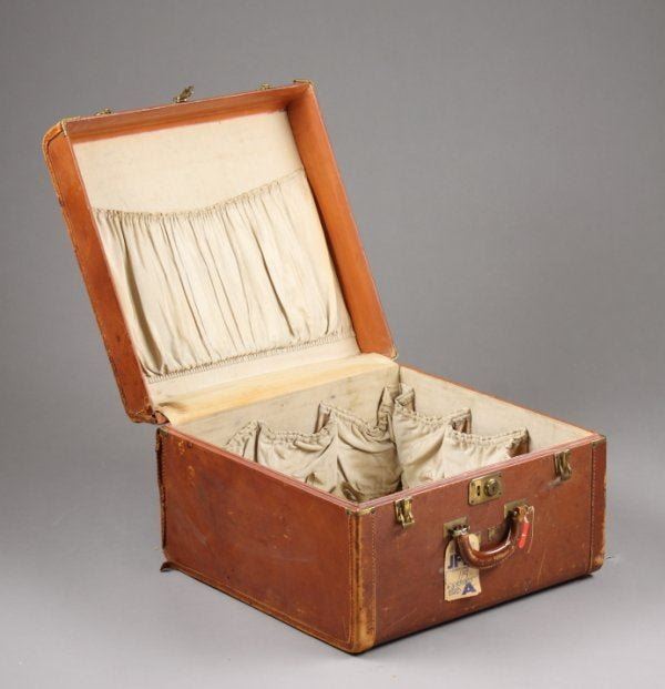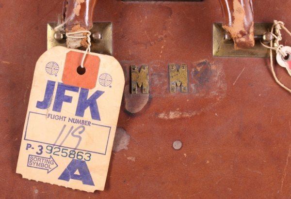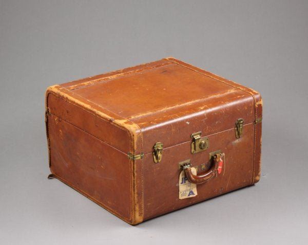 Brown leather hard-shell suitcase with brass initials "MM," owned and used by Marilyn Monroe. 18 by 18 1/4 by 11 3/4 inches.