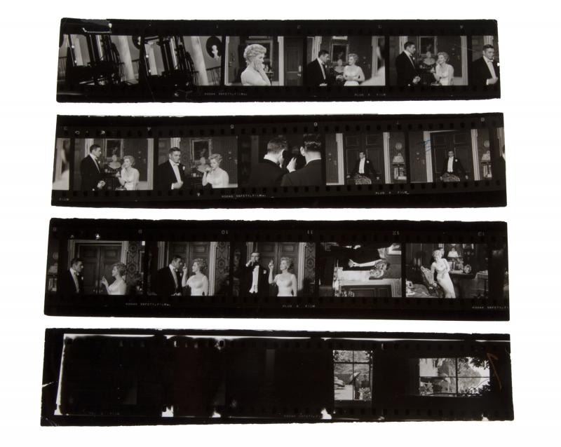 A group of four contact sheet strips with 20 frames taken by Milton Greene of Marilyn Monroe and Laurence Olivier on the set of The Prince and the Showgirl (Warner Bros., 1957).