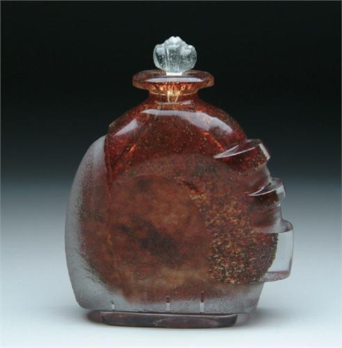 MARINOT ART GLASS BOTTLE. Interesting freeform bottle is internally decorated with mottled orange and brown encased with a heavy layer of clear crystal. Outside layer is deeply cut and acid textured in Art Deco design. Signed on the underside with etched signature "Marinot". SIZE: 8-1/2 in. t. CONDITION: Very good to excellent. 5-61111
