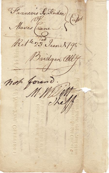 (1740 - 1830) American soldier, Sherriff and Mayor of New York, and a leader of the Sons of Liberty of NY, with Washington and Sullivan and a commander of forces in the Mohawk Valley. Partly-printed D.S. 1p. extreme oblong 8vo., New York, June 4, 1795, an arrest warrant boldly signed on verso: "Not found M. Willett, Sheff". Folds with some separations thereon, toning and wear, still generally good condition.