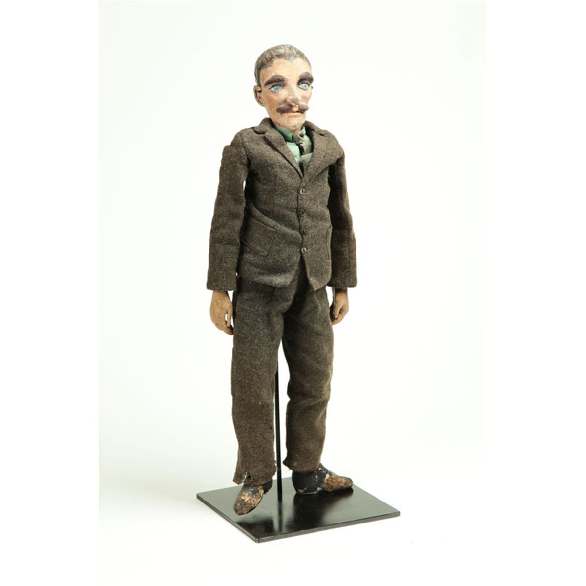 American or European, 1910-1940, wood and fabric. Wonderfully carved and painted head, hands, and feet, and a wool suit. Leather shoes are largely deteriorated. 23 1/2"h.