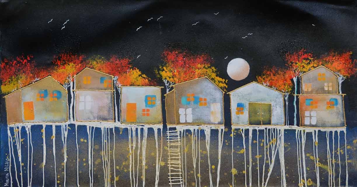 MARITA MILKIS **HOUSES ** ORIGINAL. Artist: Marita Milkis(b. 1962) - Title: Houses - Medium: Original Acrylic on Canvas - Signature: This one-of-a-kind work is hand-signed by the artist at the bottom of the image - Image Size: Approximately 16 inches x 30 inches - Framed: Unframed on Unstretched Canvas - Details: This work comes with a Certificate of Authenticity - Biography: Marita Milkis was born in Russia in 1962 and now lives in Israel. - "I created a lot of different works. From abstract graphics on paper to the three dimensional panels of wood, metal, leather and, of course, the colors! In my work there are a lot of my different worlds: the conscious and subconscious, reality and fiction, the beautiful and the ugly, harmonious and discordant to the horror. I like to create! In my work, there are different styles, textures and directions ... Pencils, pens, paint, fabric, wood, metal - all that excites my imagination!.. It makes me happy!"- Marita Milkis - Warranty: Item GUARANTEED to be as described