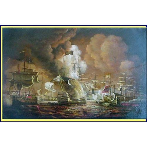 Painting of a number of sailing ships, looking very fierce, if bedraggled, at day's end. Huge clouds in a darkening sky. One of the ships appears to be on fire. Men in a row boat,highlighted in red by the sun's dieing rays, row away from it. The top of the mast of a sunken ship appears in the foreground. Choppy seas. painted on copper, which is very slightly buckled.