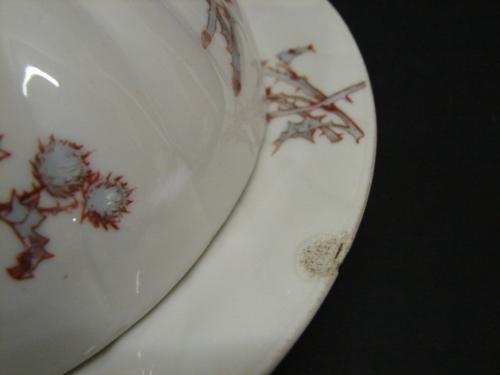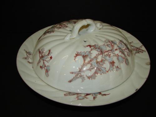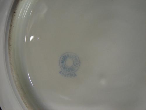 MARK & GUTHERZ (1890-1900) AUSTRIAN PORCELAIN PANCAKE DISH WITH LID. Transfer decorated branch and thorn decorated. Shows two chips along outer edge of plate. Marked on bottom. 4.25” H, 9” Dia.
