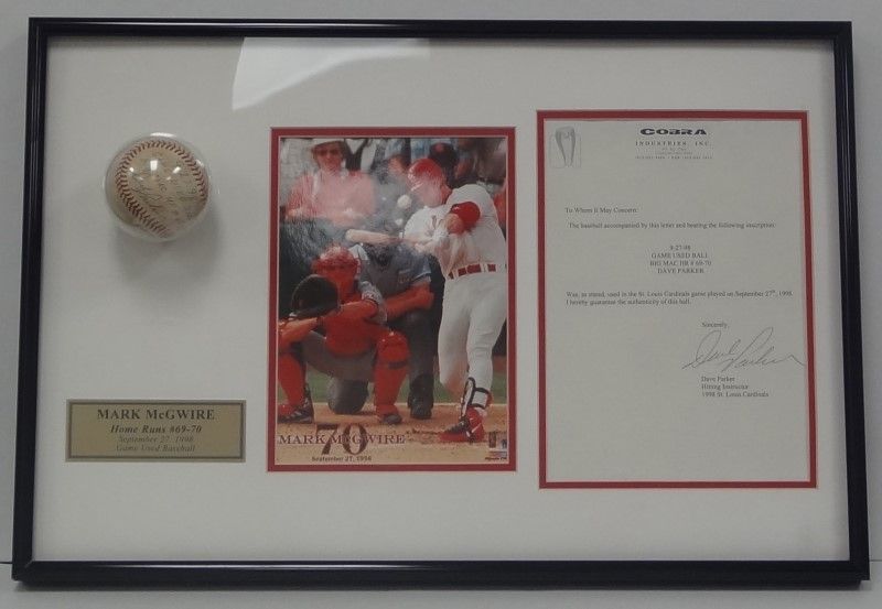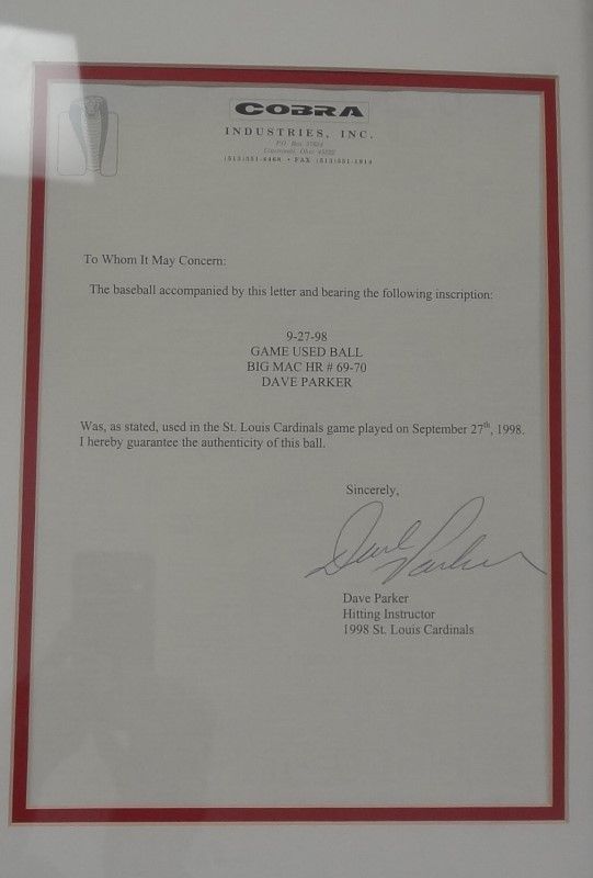 24" x 16" Custom Framed Mark McGwire 8 x 10 Photo, Cobra Industries Letter from Dave Parker Hitting Instructor stating that the Official National League Baseball Game Used 9-27-98 Big MAC HR #69-70 signed "Dave Parker" - Guarantee Authenticity. Ball, Lett