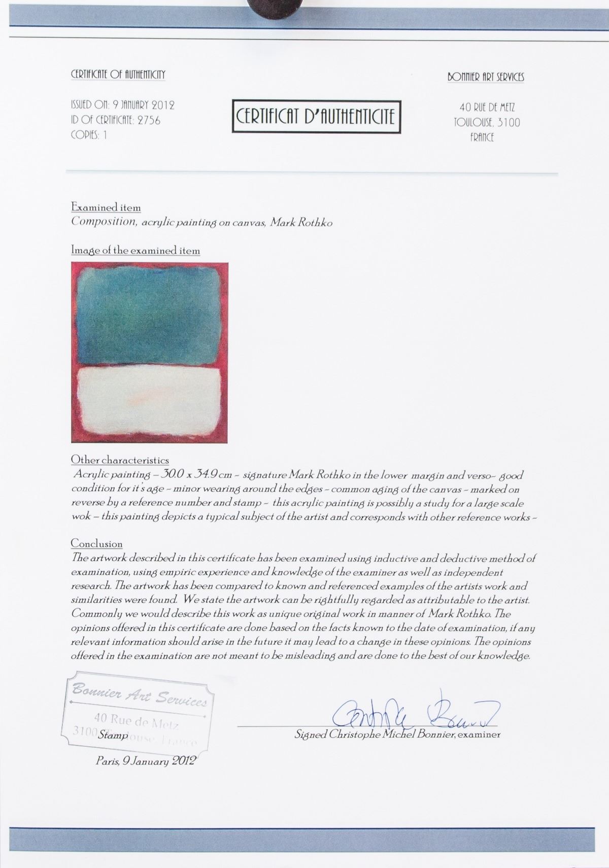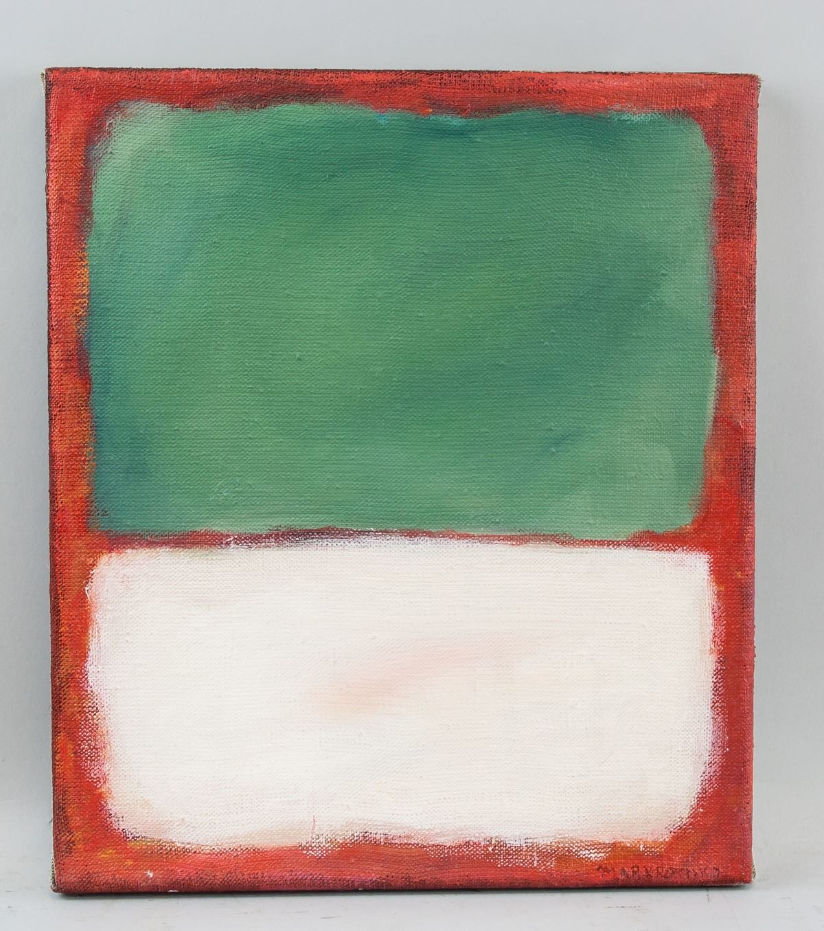 Oil on canvas. Featuring an abstract expressionist composition. Signed and attr. Mark Rothko (American, 1903-1970) on the lower right corner and verso. Marked with gallery and notation on verso. Accompanied with a certificate of authenticity. 34.9 x 30.0 cm (13.7 x 11.8 inches). Mark Rothko’s search to express profound emotion through painting culminated in his now-signature compositions of richly colored squares filling large canvases, evoking what he referred to as “the sublime.” One of the pioneers of Color Field Painting, Rothko’s abstract arrangements of shapes, ranging from the slightly surreal biomorphic ones in his early works to the dark squares and rectangles in later years, are intended to evoke the metaphysical through viewers’ communion with the canvas in a controlled setting. PROVENANCE: Private estate (Toronto, ON)