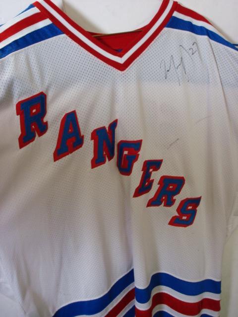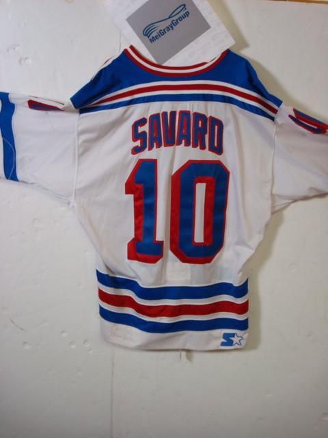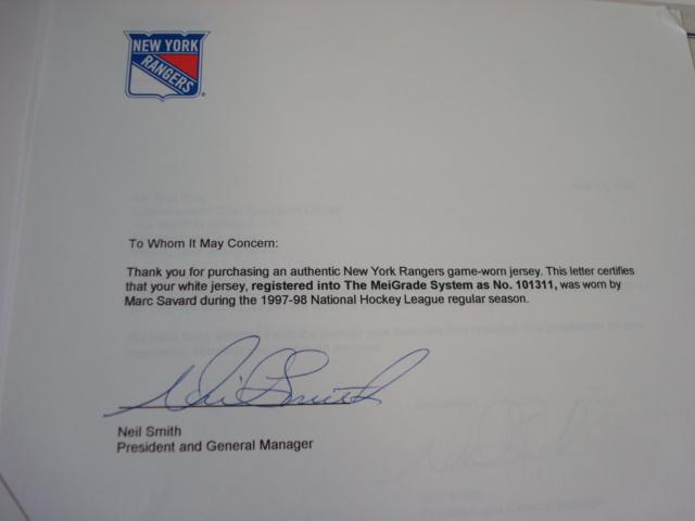 MARK SAVARD AUTOGRAPHED GAME WORN JERSEY New York Rangers 1997-98 Season. With MeiGray Group Authentication and Registration Certificate. Savard Played with the Rangers, Boston, Calgary and Atlanta, Currently with Boston. (400-600)