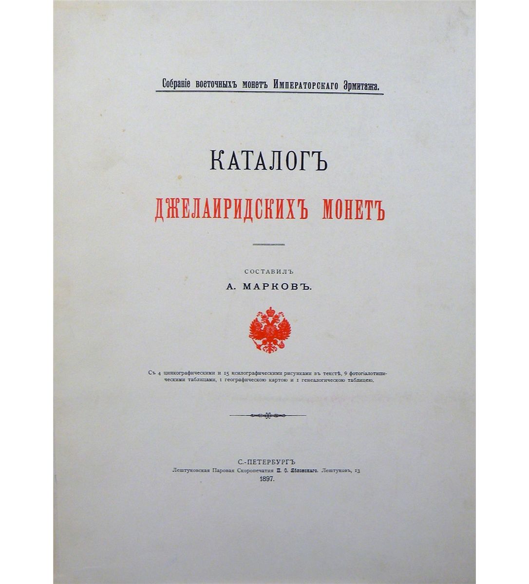 Markov, A. КАТАЛОГЪ ДЖЕЛАИРИДСКИХЪ МОНЕТЪ. 1989 London reprint of the 1897 original. Folio [34.5 by 25.5 cm], original printed card covers. (4), v, (1), lxxxii, 64, (4) pages; folding map printed in three colors; text figures; 9 plates of coins. Near fine. The useful reprint of this very rare and important work on Jalayirid coins. No. 48 of only 100 copies printed. Gromachevskii 207б. Mayer 1130. From the library of Quentin Archer.